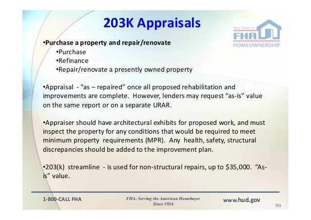 2012-38-E FHA 203K – Report Completion Requirements 12/19/12 Refinance As-Is Value Statement on Refinances – On refinances, For more information regarding HUD/FHA and property inspection requirements refer to: www.hud.gov HUD FHA 4150.2 Appendix D: ... Read Here